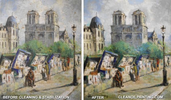 This is especially evident in paintings which have never been varnished. Cleaning and nourishing the paint surface, followed by varnishing, can restore the colors to reflect the artist's original vision.